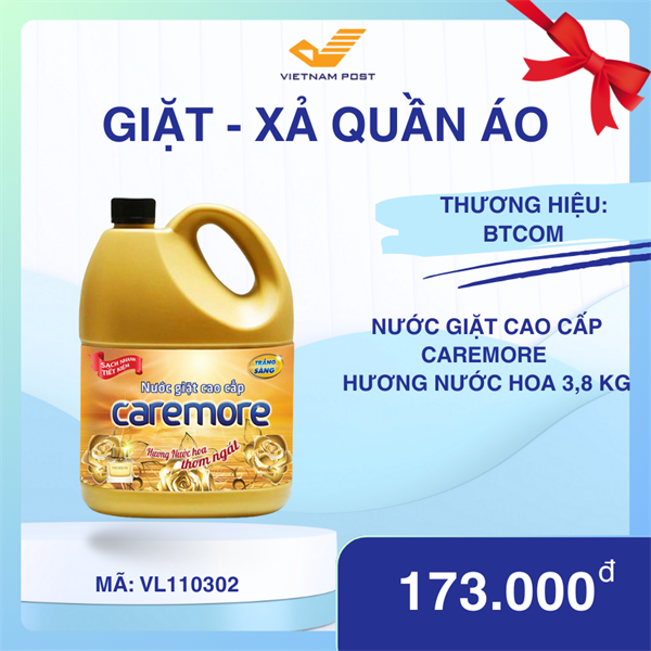 Đặc trưng sản phẩm:Nước giặt cao cấp Caremore hương nước hoa với công thức cải tiến mới, tan nhanh trong nước và thấm sâu vào từng sợi vải giúp dễ dàng giặt sạch quần áo, giữ màu sáng đẹp như mới và ngăn chặn vết bẩn bám trở lại lên quần áo.Hương nước hoa dịu nhẹ lưu lại trên quần áo tạo cảm giác dễ chịu và tươi mới.Hướng dẫn sử dụng :Tách riêng quần áo trắng và quần áo màu khi giặt.40ml cho 1-20 chiếc quần áo, 15ml cho 4-5 chiếc quần áo.Hướng dẫn bảo quản: Bảo quản sản phẩm nơi khô ráo thoáng mát, tránh ánh nắng trực tiếp.Thông tin cảnh báo: Không được uống, để xa tầm tay trẻ em. Nếu sản phẩm dính vào mặt hãy rửa sạch bằng nước. Nếu nuốt phải sản phẩm, uống ngay 1 ly sữa hoặc nước. Nếu cần thì đến cơ sở y tế.Quy cách trình bày: Can 3.8kg (3.6 lít)