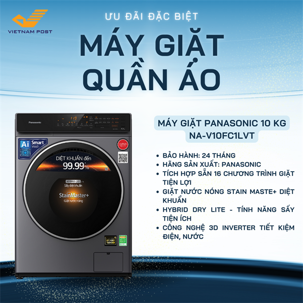 Đặc điểm nổi bậtMáy giặt có khối lượng giặt tối đa 10 kg, thích hợp cho gia đình từ 5 - 7 ngườiGiặt nước nóng Stain Master+ loại bỏ 99.99% vi khuẩn, 99% tác nhân dị ứngHệ thống Active Foam tạo bọt siêu mịn giúp giặt siêu sạch, hạn chế cặn bột giặtCó chế độ hỗ trợ sấy quần áo với công nghệ lưu chuyển không khí cực tiện lợiTự động vệ sinh loại bỏ cặn bột giặt, ngừa mảng bám và mùi hôi trong lồng giặtCông nghệ 3D Inverter giặt sạch tối ưu, tiết kiệm điện và kéo dài tuổi thọ máyChế độ giặt nhanh trong 15p, tổng 16 chương trình giặt phục vụ đa dạng nhu cầuSấy diệt khuẩn bảo vệ làn da nhạy cảmMáy giặt sấy Panasonic NA-V10FC1LVT 10/2kg sử dụng công nghệ sấy Hybrid Dry hoạt động bằng cách hút không khí bên ngoài qua các lỗ thông khí, sau đó làm nóng khí bằng máy sưởi 300W để duy trì nhiệt độ bên trong lồng giặt xấp xỉ 55°C, nhiệt độ lý tưởng làm khô quần áo và giúp loại bỏ tới 99%*. Nhờ đó, góp phần bảo vệ sức khỏe gia đình bạn, để bạn an tâm mỗi khi mặc quần áo, đồng thời luôn giữ quần áo ở trạng thái tốt nhất.